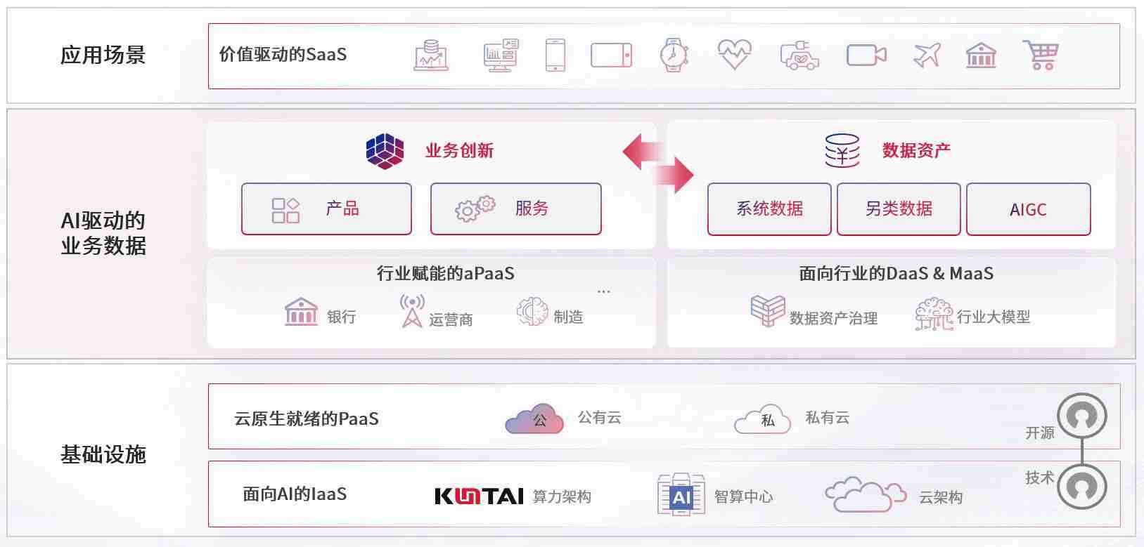 数字时代,,,围绕企业数字化转型的关键要素,,NG娱乐数码开创性的提出数云融合战略和技术体系框架,,着力在云原生、、、数字原生、、AI原生和信创产业上架构产品和服务能力,,为处在不同数字化转型阶段的快消零售、、、、汽车、、金融、、医疗、、政企、、教育、、、、运营商等行业客户提供泛在的敏捷IT能力和融合的数据驱动能力,,,构建跨界融合创新的数字业务场景和新业务模式,,助力企业级客户建立面向未来的核心能力和竞争优势,,,全面推动社会的数字化、、、智能化转型升级。。。。