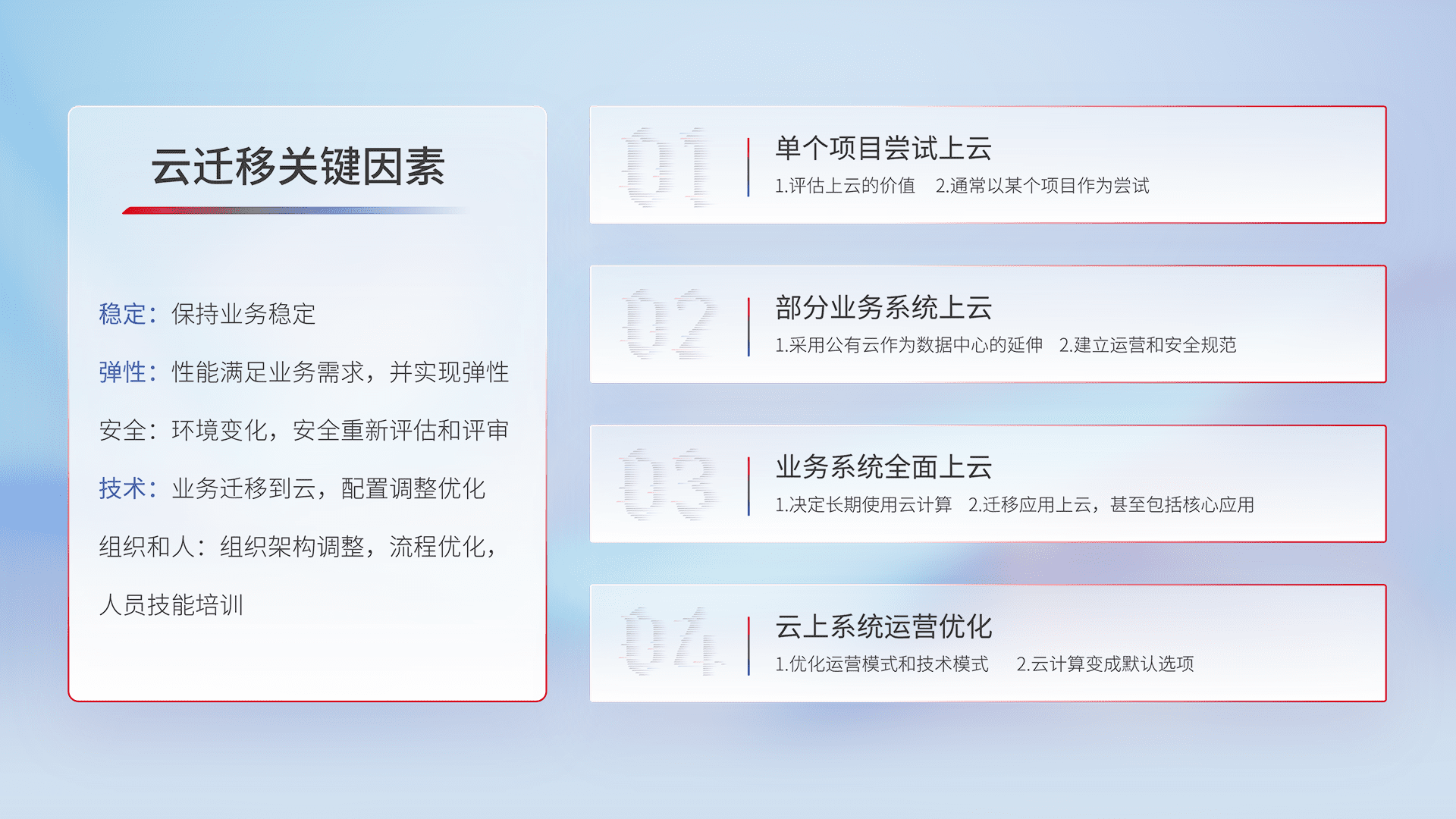 结合实际业务,,从规划设计、、云平台选型、、、云原生改造、、、数据迁移、、、、集成交付,,,,迁移全过程为客户识别最佳上云路径,,,,做好风险识别管理,,设计网络架构、、、、身份权限、、、、安全审计合规、、、、操作审计、、、、日志审计、、、、监控告警策略、、多站点容灾设计等,,对云上基础设施进行整体规划,,,,提升IT治理水平,,以满足弹性、、高可用、、、高性能的需求。。。