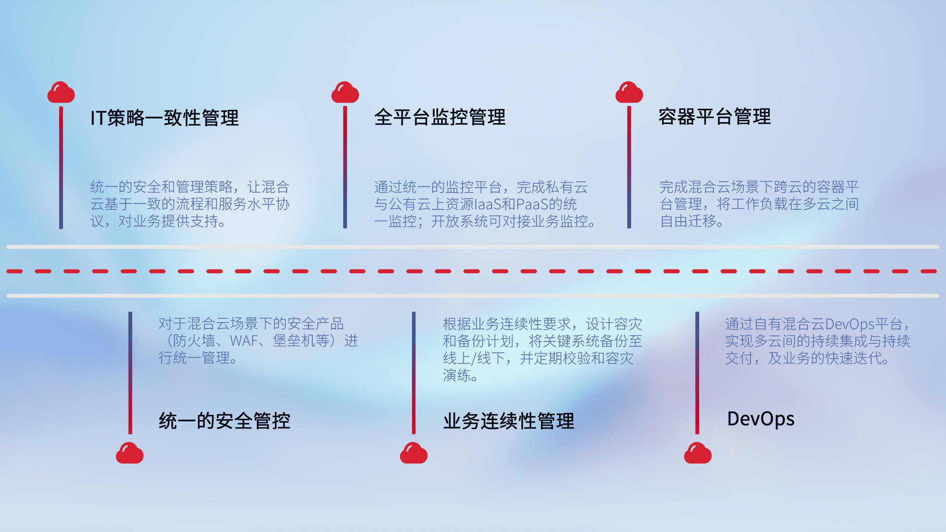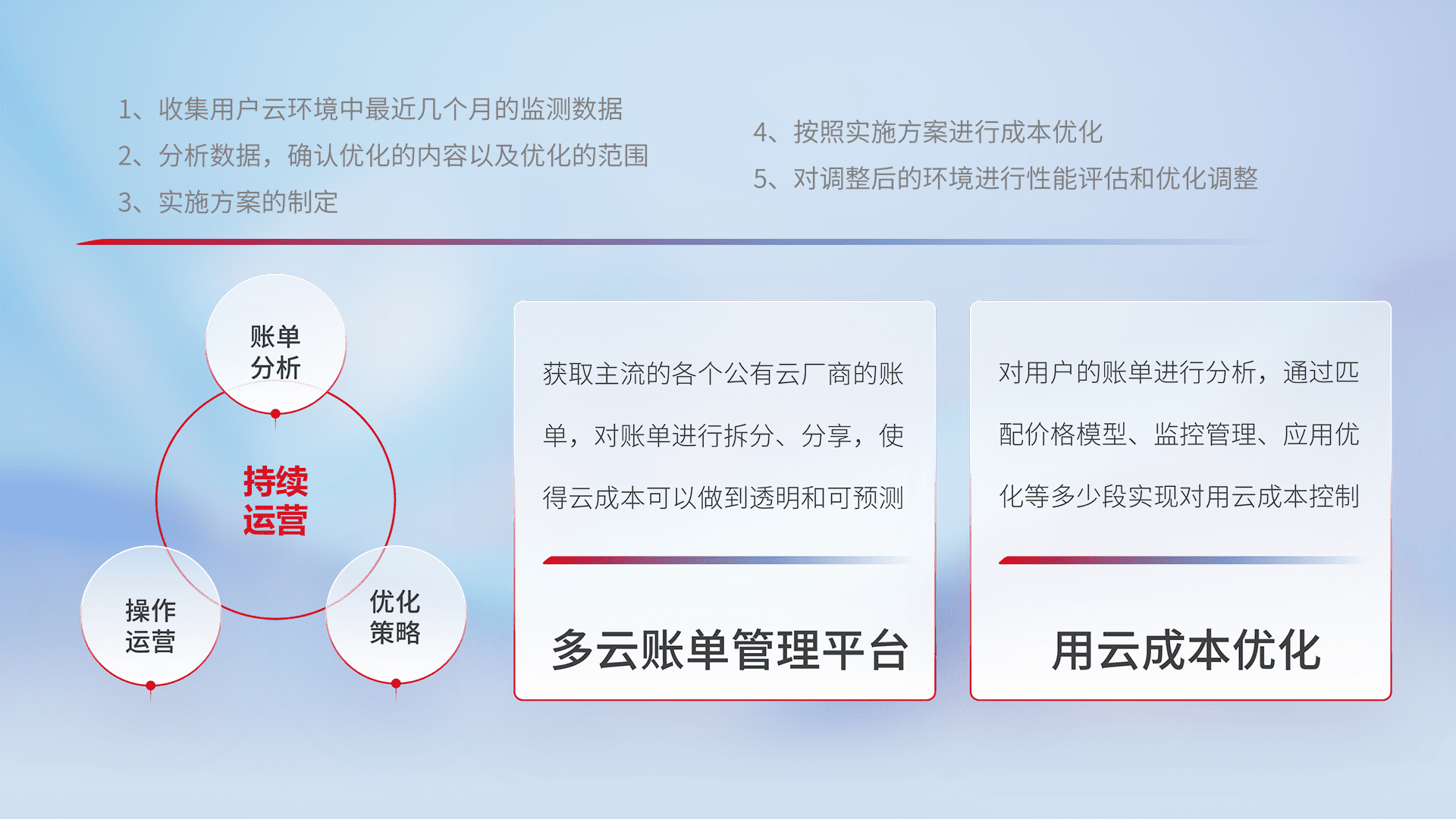 通过多云纳管,,,,以统一的资源数据模型把客户的云资源进行抽象和封装,,,,进而实现对多云资源的统一操作,,,,保障云资源管理的可靠性、、稳定性与可用性。。。。量身定制化运维内容,,配置、、、开发运维、、、补丁管理、、、、备份、、、监控、、、、认证和访问管理、、审计和日常巡检等,,,,保障在用云过程中的可靠度,,,稳定度以及高可用率。。